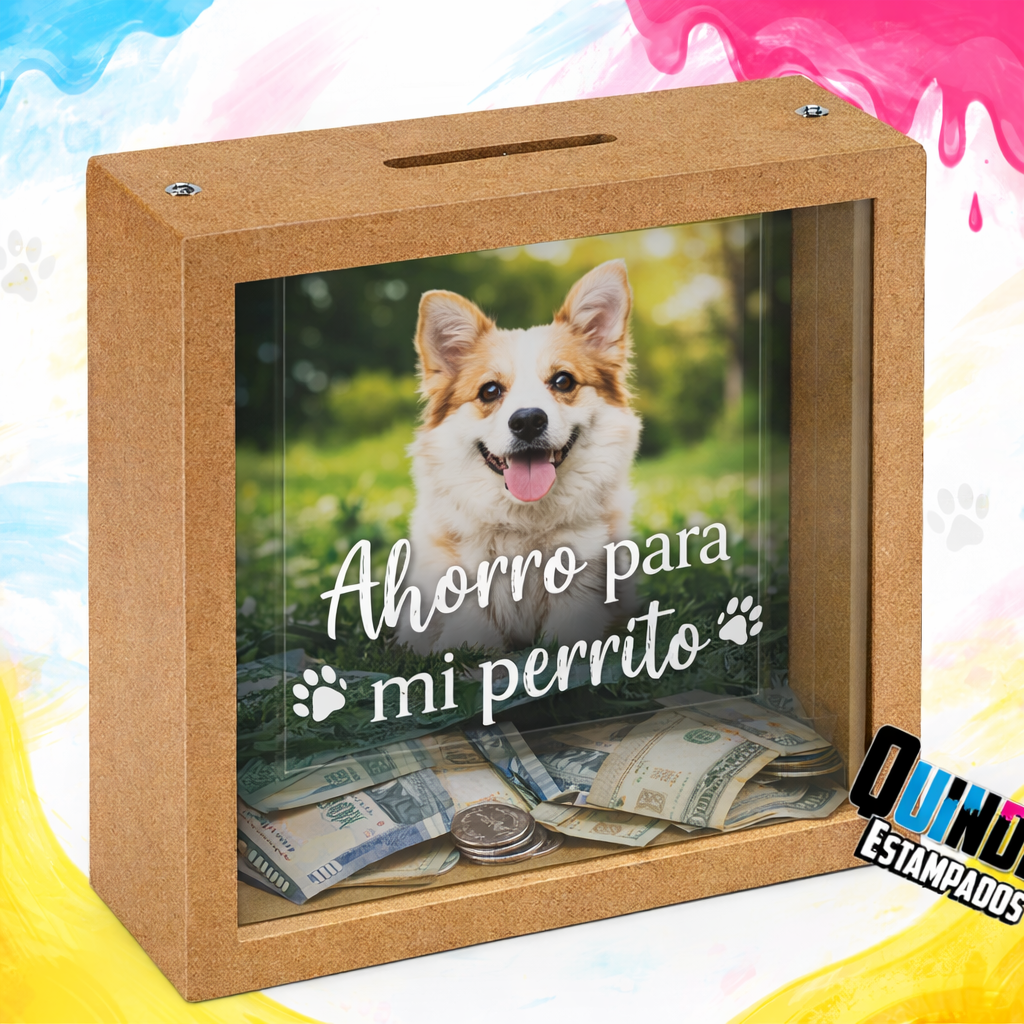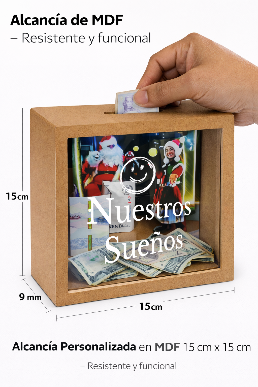 Alcancía elaborada en MDF de 9 mm de espesor, resistente y duradera, ideal para convertir el ahorro en algo visual, motivador y especial.