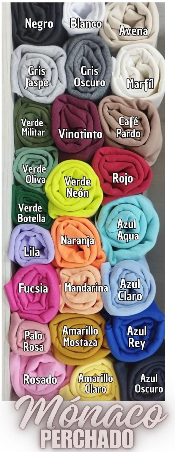 Amarillo claro, avena, azul aqua, azul claro, azul oscuro, azul rey, blanco, café pardo, gris jaspeado, gris oscuro jaspe, lila, marfil, mostaza, negro, palo rosa, rojo, rosado, verde botella, verde oliva y vinotinto.