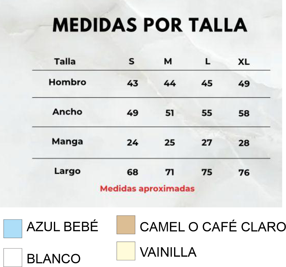 DISPONIBLE EN: Cámel, azul bebé, blanco y vainilla